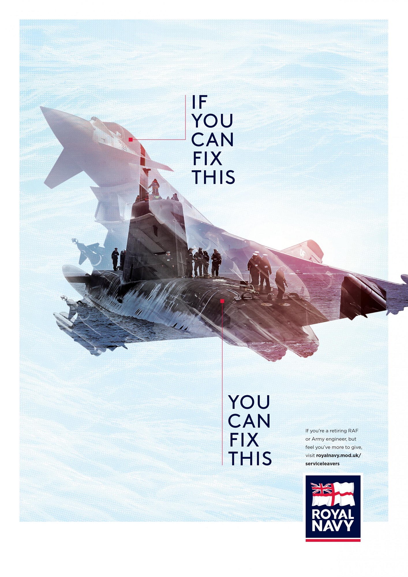 Highly skilled engineers are in short supply, and the Royal Navy needs them. Meanwhile, once engineers get to a certain age, the Army and RAF engineers are given retirement. We want to speak to these talented individuals and make them aware that they can continue their military career in the Royal Navy, but showing how similar the role is. The ads ran in both Army and RAF magazines.