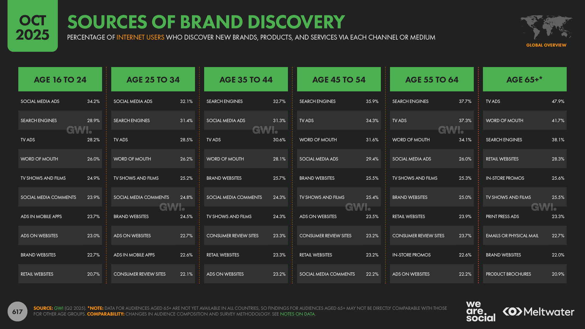 Digital 2026 highlights generational differences when it comes to seeking out information from brands on social media. For younger internet users aged 16 to 34, social media ads are the top driver of brand awareness, outperforming search engines and TV ads. Social media ads also rank second behind search engines for those aged 35 to 44. The data shows a clear generational divide, with older audiences still relying on more traditional channels.