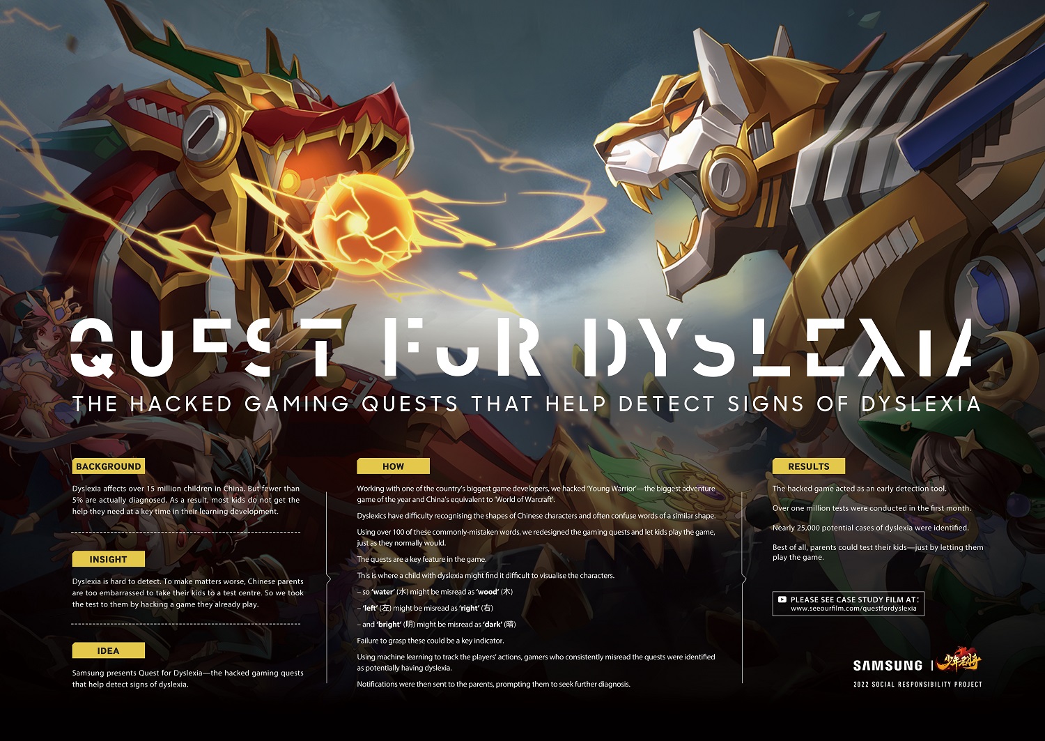 Cheil PengTai Beijing x Hong Kong’s "Quest for Dyslexia" for Samsung was another big winner, also picking up five trophies, with two Golds and three Silver awards. "Quest for Dyslexia" hacks China's most popular game for kids creating alternate quests using visually similar Hanzi characters to detect dyslexia and notify parents when a pattern of anomalies occurs.